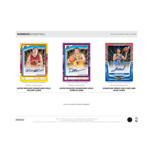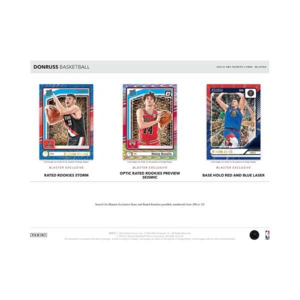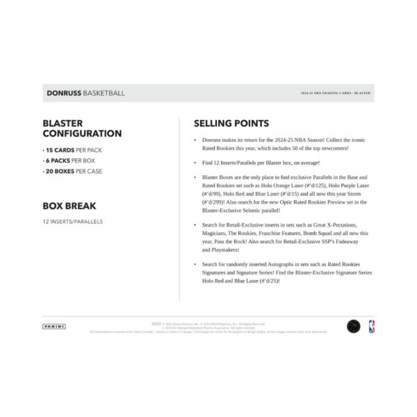 - The 2024-25 Panini Donruss NBA Blaster Box returns with 6 packs of 15 cards, spotlighting 50 of the top-rated rookies. Each box averages 12 inserts or parallels, including exclusive Blaster-only hits like Holo Orange Laser (#/125), Holo Purple Laser (#/99), Storm (#/299), and ultra-rare Holo Red and Blue Laser (#/15). Discover new additions like the Seismic Optic Rated Rookies Preview and retail-only inserts such as Fadeaway, Playmakers, Pass the Rock, and more. Autograph hunters can also chase exclusive Signature Series Holo parallels numbered to 25.