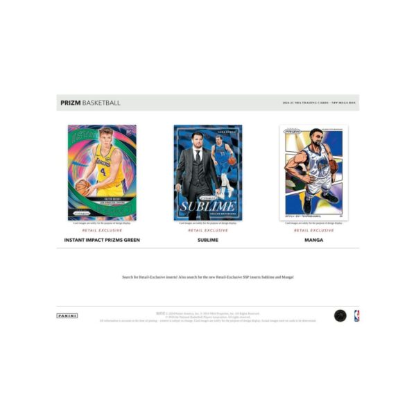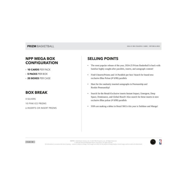 - The 2024-25 Panini Prizm NBA Basketball Mega Box delivers excitement with 5 packs of 10 cards, featuring 10 exclusive Pink Ice Prizms. Chase rare Blue Pulsar (#’d/99) parallels, SSP Sublime and Manga inserts, plus potential Penmanship and Rookie Penmanship autographs.