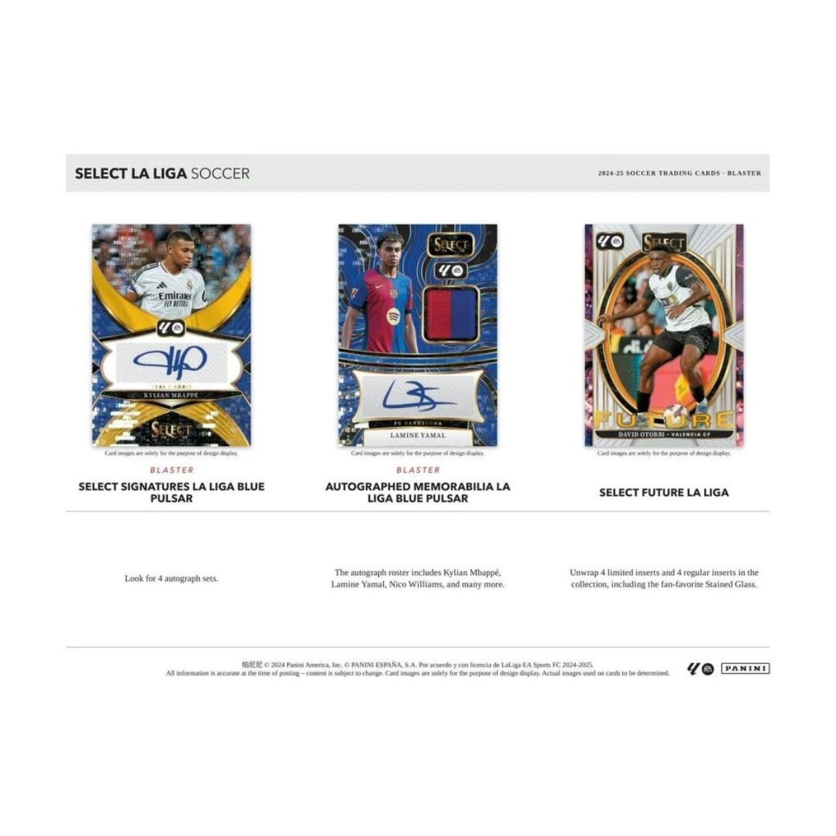 - The 2024–25 Panini Select La Liga Soccer Blaster Box marks the return of the fan-favorite Select brand to Spanish football, featuring all 20 La Liga teams in stunning detail. Each blaster includes 6 packs with 4 cards per pack, offering a total of 24 cards per box packed with exclusive content. Build your collection with the 250-card tiered base set Terrace, Mezzanine, and Field Level plus chase exciting parallels like Pink Mojo (#/115) and the elusive Checkerboard. Discover powerful inserts like Equalizers, Select Future, Unstoppable, and the all-new Snapshots, and hunt for rare autograph cards from stars like Kylian Mbappe, Lamine Yamal, Nico Williams, and more.