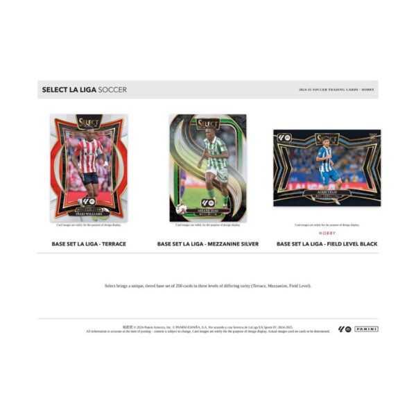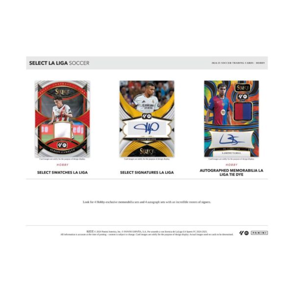 • The iconic Panini Select brand returns to the pitch with the 2024-25 La Liga release highlighting all 20 top-tier teams in Spain’s premier football league! This high-end collection features a 250-card base set across three distinct levels: Terrace, Mezzanine, and Field Level, each offering escalating rarity. Collectors can chase a vibrant rainbow of parallels, including the newly introduced Bronze Checker and the ultra-rare Honeycomb parallel. Enhance your collection with dynamic insert sets such as Equalizers, Select Future, Unstoppable, and the all-new Snapshots. Plus, each hobby box delivers 3 autograph and/or memorabilia cards, with a star-studded lineup of signers like Kylian Mbappe, Lamine Yamal, Nico Williams, and more!