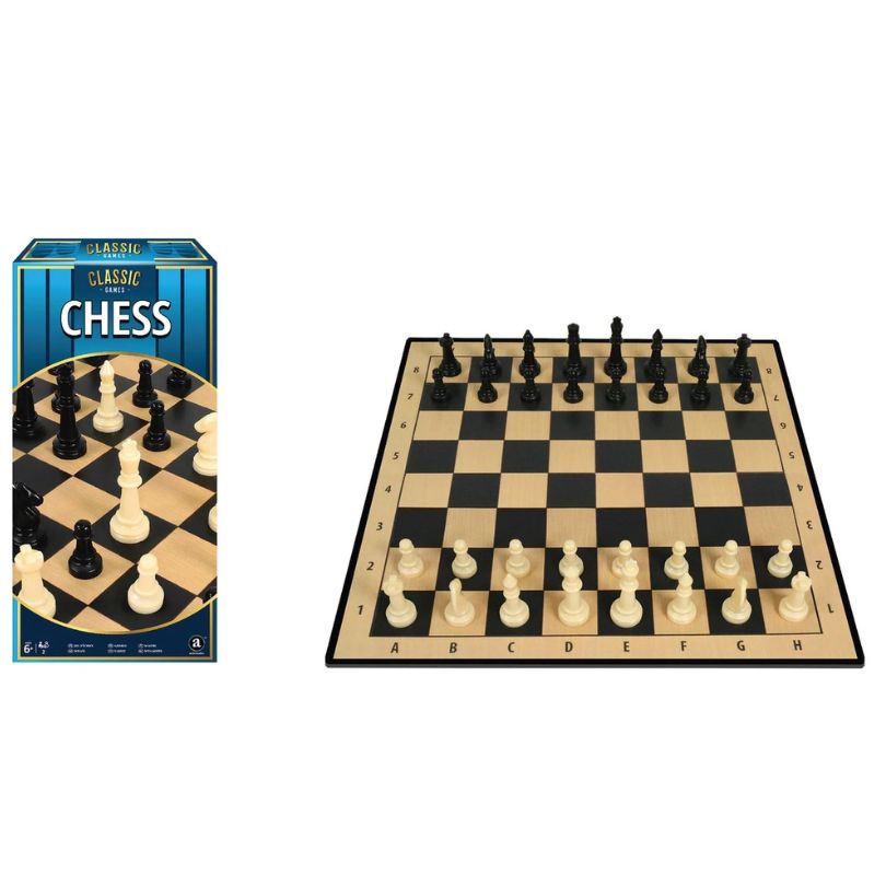 • A basic chess set featuring classic wooden pieces on a checkered board, ideal for beginners and casual players
