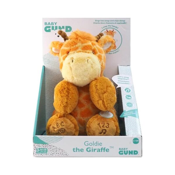 - Bring joy and laughter to your little one with Baby GUND Goldie the Giraffe, an adorable interactive plush toy designed to entertain and comfort babies and toddlers. This cuddly giraffe moves its head, flaps its ears, and sings while engaging in a fun game of peek-a-boo! With super-soft plush fabric and embroidered details, Goldie is a perfect huggable companion for playtime and bedtime alike.