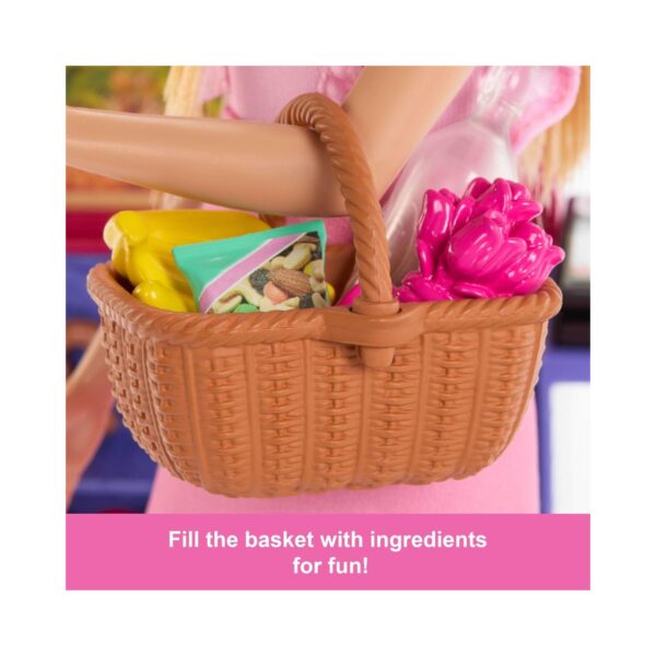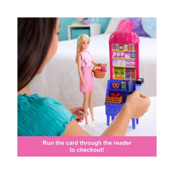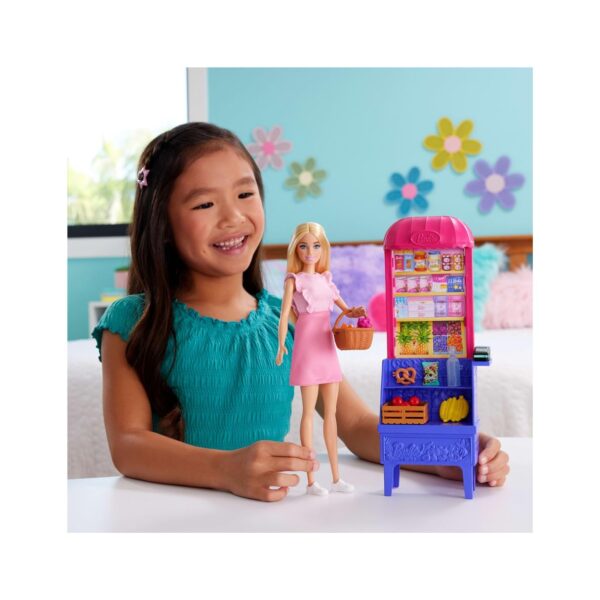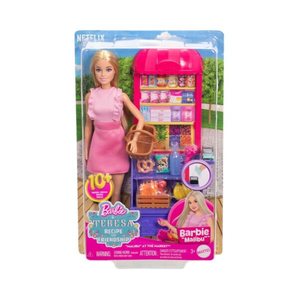 - Join Barbie ‘Malibu’ on a fun-filled shopping adventure with the Barbie Malibu at the Market Playset! Inspired by the movie Barbie and Teresa Recipes for Friendship, this vibrant playset includes a stylish Barbie doll dressed in a pink ruffled dress and white sneakers, ready for her market trip. The colorful grocery stand features two shelves perfect for displaying delicious treats like bananas, carrots, apples, chips, and a big pretzel. With realistic accessories like a shopping basket, produce crate, card scanner, and card, kids can dive into imaginative storytelling and shopping fun. Perfect for kids ages 3 and up who love creative play and Barbie adventures!