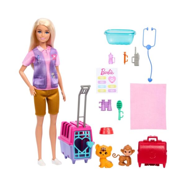 - Join Barbie on her exciting animal rescue journey! Dressed in her stylish yet practical uniform, Barbie is ready to help two adorable baby animals a tiger and a monkey. With a carrier that features a working door and handle, kids can safely transport the tiny patients. The sticker sheet lets them personalize their adventures even more!