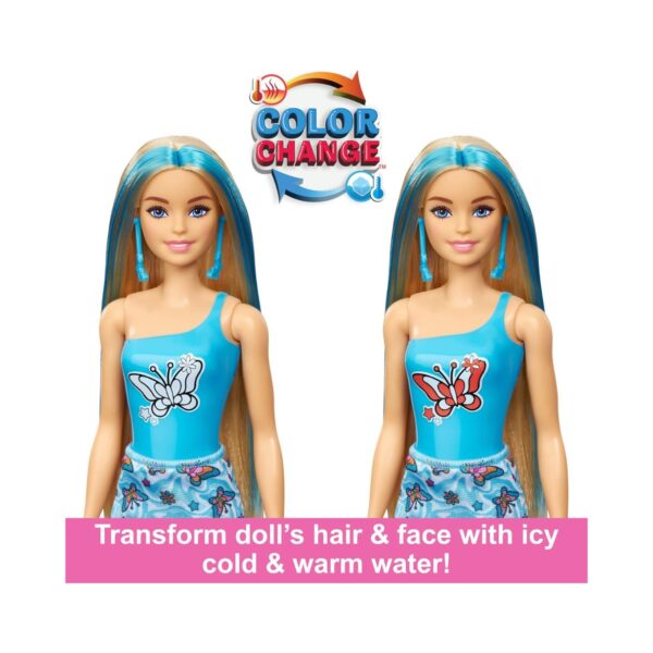 - The Barbie Color Reveal Groovy Series Doll offers a colorful and exciting surprise experience with six surprises in one package! Unbox the fun as kids reveal a psychedelic pink-coated Barbie doll and discover a collection of fashionable accessories and clothing. Barbie’s look transforms with the use of cold and warm water, revealing a color-changing decal on her bodice. From funky earrings to a flower-power brush, this set is packed with vibrant style, perfect for young fashionistas who love to get creative. Ideal for kids aged 3 and up, Barbie Color Reveal dolls inspire imaginative storytelling and endless styling possibilities.