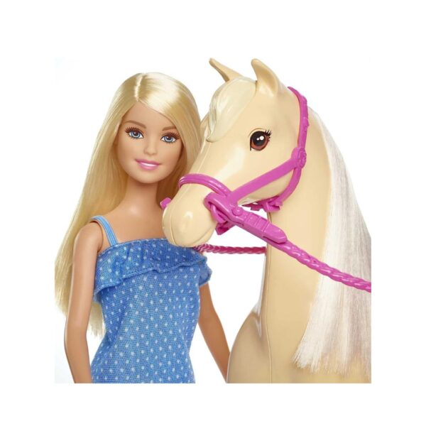 - Includes Barbie doll and light brown horse with a soft white mane and tail.