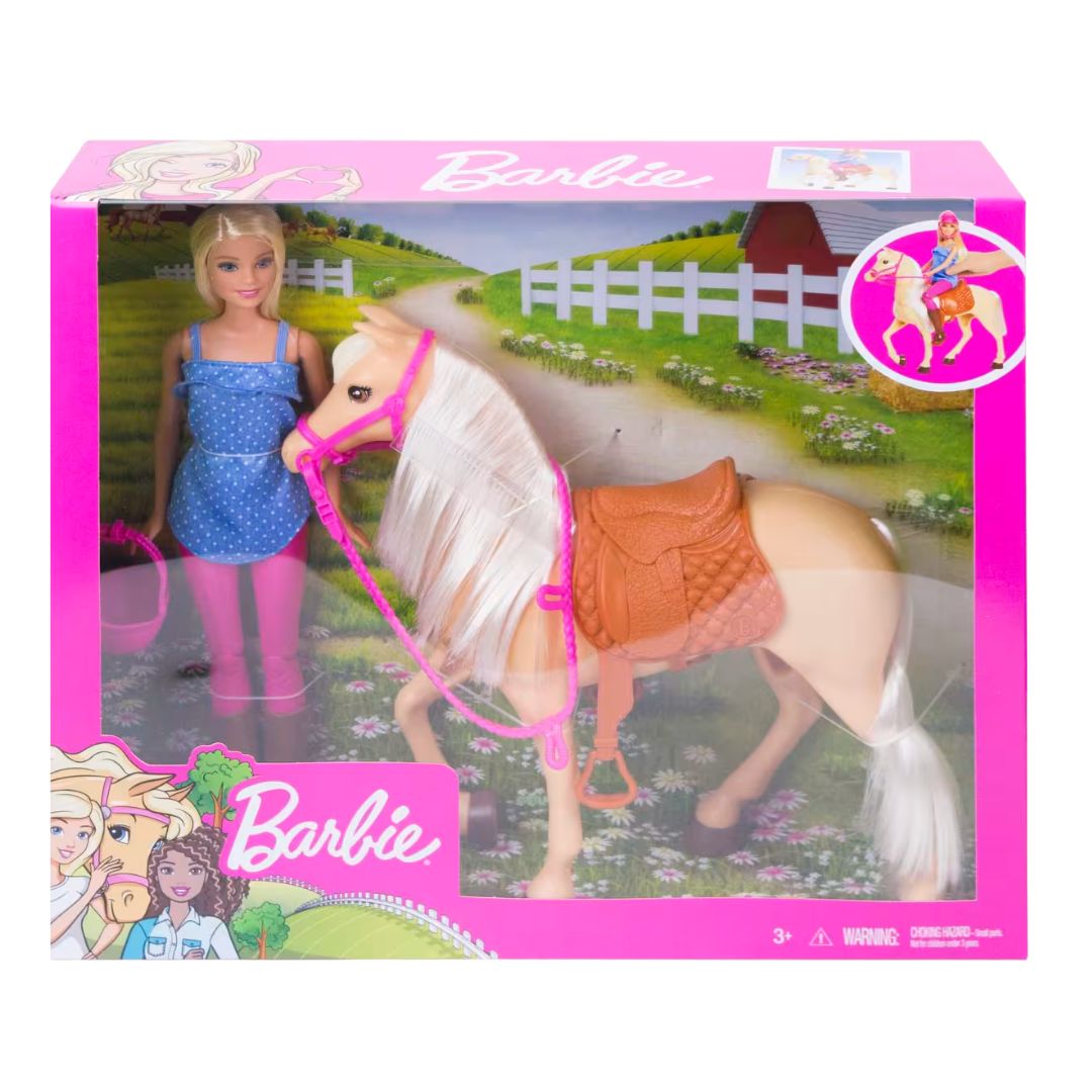 - Saddle up for endless adventures with the Barbie Doll and Horse Playset! Barbie and her beautiful light brown horse are ready to explore the great outdoors together. The horse features a soft white mane and tail, along with a removable pink bridle and brown saddle for realistic riding play. Barbie is dressed for the occasion in her stylish riding outfit — pink pants, a denim polka-dot top with ruffles, tall brown riding boots, and a matching pink helmet. With bendable knees so she can sit securely in the saddle, kids can enjoy hours of imaginative play as Barbie and her loyal horse gallop off on exciting journeys.
