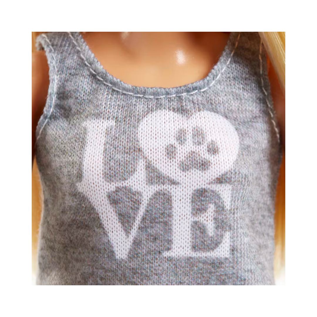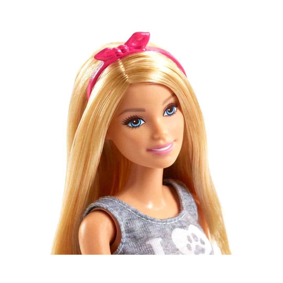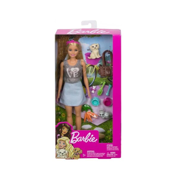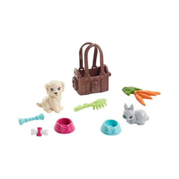 - Delight animal lovers with the Barbie Doll and Pets Playset, featuring Barbie and her adorable furry friends — a playful tan puppy and a sweet gray bunny! This fun-filled gift set lets kids explore the joy of caring for animals with realistic accessories including a bone, carrots, two feeding bowls, a brush, and a rope toy for endless storytelling fun. Barbie shows her love for pets in a stylish outfit a gray tank with a paw-print “love” graphic, a blue-and-white striped skirt, white shoes, and a pink bow headband. With so many ways to play, this set encourages kindness, creativity, and imagination while inspiring kids to dream big with Barbie.
