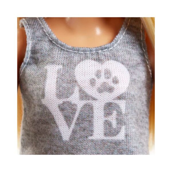 - Stylish Barbie outfit featuring a paw-print love top, striped skirt, white shoes, and pink bow headband.