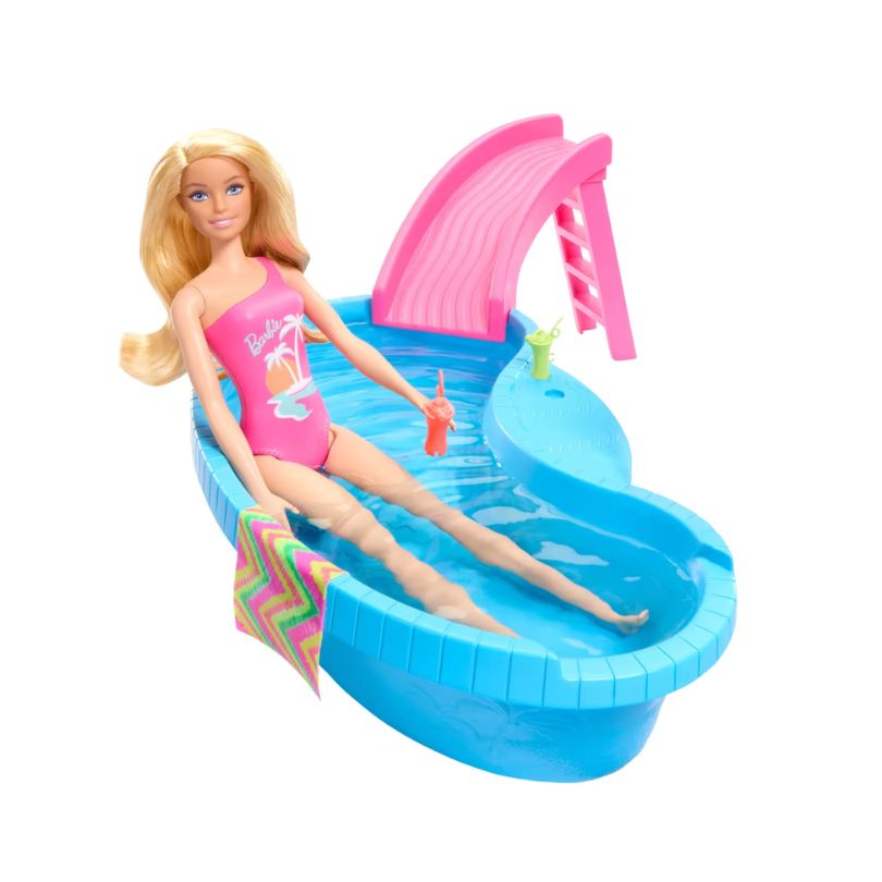 - Complete playset included: Comes with 1 Barbie doll, 1 pool, 1 slide with ladder, 1 towel accessory, and 2 drink accessories for fully equipped play.
