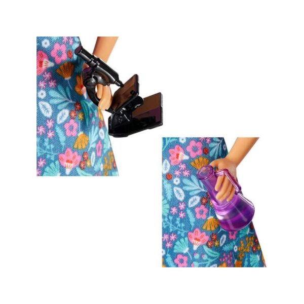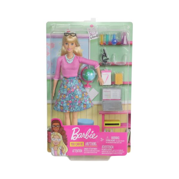 - Inspire young minds with the Barbie Teacher Doll playset! This engaging set lets kids explore the world of education through imaginative role-play. Barbie is ready to lead the class with a variety of school-themed accessories, including a spinning globe, a laptop, and STEM-related tools like a microscope and beakers. Dressed in a stylish pink top, blue floral skirt, and black eyeglasses, Barbie is all set to teach and inspire. With multiple interactive pieces, this set encourages learning and storytelling fun for children aged 3 to 7.
