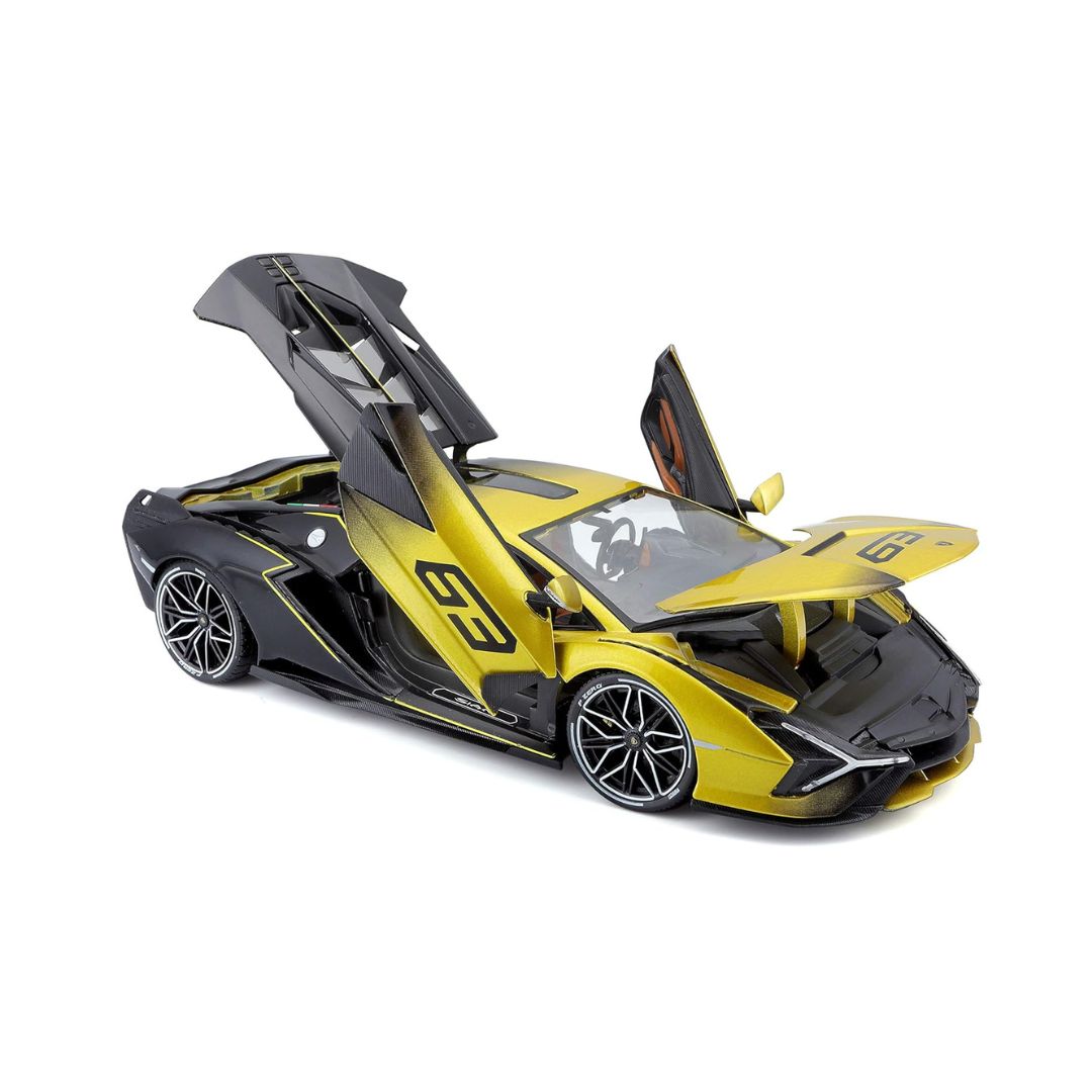 • Diecast model of a 1/18 scale Lamborghini Sian FKP 37 in a fade yellow finish, showcasing detailed design and craftsmanship.