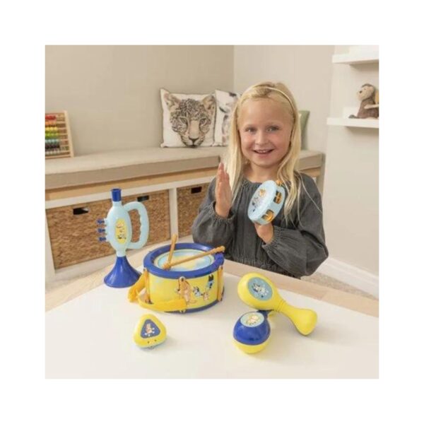 - The Bluey’ s Band Set is a vibrant and stimulating musical playset designed to ignite the imagination and creativity of young musicians. Inspired by the popular children’s television show “Bluey,” this set includes 8 musical instruments that are perfect for any budding musician. With a trumpet, castanet, tambourine, maracas, and a drum complete with drumsticks, children can explore a variety of sounds and rhythms as they embark on musical adventures with their favorite Bluey characters.