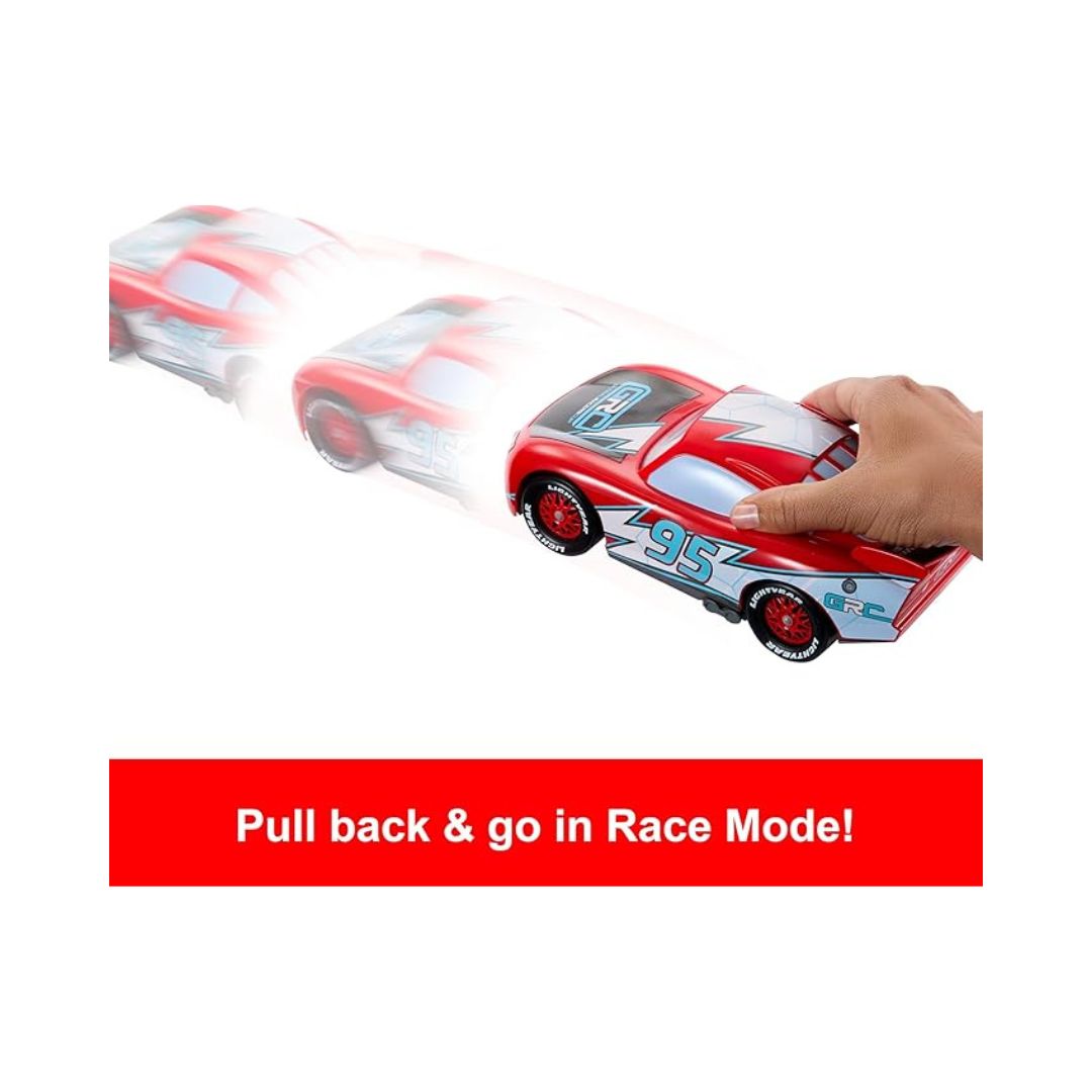 • The Mattel Disney and Pixar Cars Lightning McQueen Drift & Race Toy Vehicle features exciting 2-in-1 racing action with both straight and drifting modes for interactive play. Kids can easily switch modes using the button underneath the car and enjoy a fun pull-back racing function. The set includes 4 paper cones to create custom race tracks or obstacle courses for added challenge. Pressing down on the top of the vehicle activates a racing expression, enhancing imaginative storytelling. At approximately 9 inches long, this large-scale toy brings the fan-favorite Lightning McQueen to life. Perfect for kids who love racing, Cars characters, and creative play. Colors and details may vary.