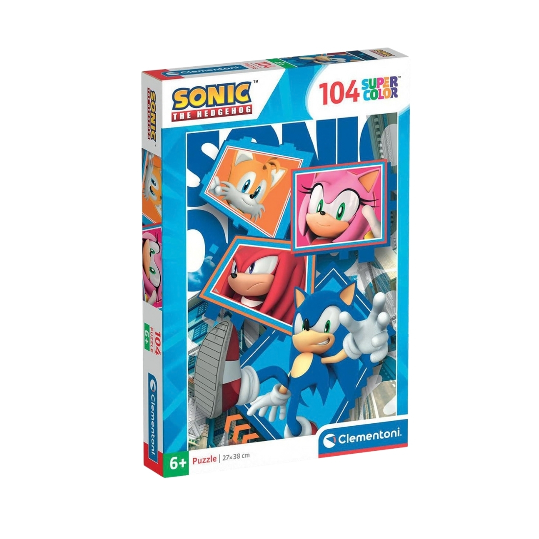 Colorful Clementoni puzzle featuring Sonic and friends, consisting of 104 pieces, ideal for fans of the franchise