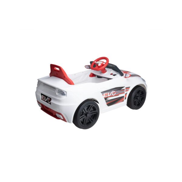 - Cruise in style with the Evo Electric Race Car. This electric ride-on offers forward and reverse drive capabilities, controlled by clear button controls and a start pedal, making it easy for your child to embark on thrilling adventures. The steering wheel features buttons that produce realistic engine sound effects and a horn for added excitement. With working headlights, opening doors, a seat belt for safety, and cool graphics, this ride-on provides an immersive driving experience. It comes with a rechargeable 6V battery included, offering a runtime of 1 hour on a single charge. With speeds up to 3kmph and a 22W motor, this race car promises exciting rides. Suitable for children aged 3 years and over, with a maximum weight capacity of 30kg.