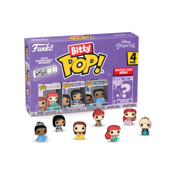 • Experience the magic of Disney Princesses in a whole new dimension with the Disney Princesses Ariel Funko Bitty Pop! Mini-Figure 4-Pack. Your beloved Funko Pop!s have been charmingly shrunk into Bitty Pop’s, allowing you to expand your Disney collection with these adorable miniaturized versions of royal heroines.