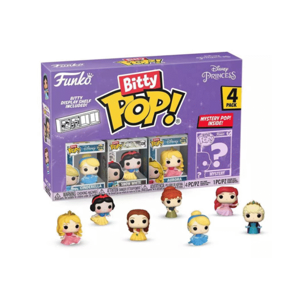 - Step into the magical world of Disney Princesses with the Bitty Pop! Disney Princesses 4-Pack, featuring Cinderella, Snow White, Aurora, and a mystery Bitty Pop! figure. These adorable miniaturized versions of your favorite royal heroines bring a touch of enchantment to your collection, each capturing the essence of these iconic characters in a compact form.