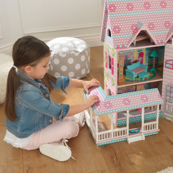 • KidKraft Abbey Manor is a new way to play. This clever Victorian dollhouse uses a double-hinged design to open up for imaginative fun or fold away for convenience. The gorgeously-detailed roof and wing open up to reveal three levels and five charmingly-illustrated rooms. The detailed wraparound porch can be removed to create new floorplans. The third-level balcony offers a perfect imaginative view for dolls to enjoy. With 16 detailed accessories, kids can create the perfect getaway for dolls up to five inches.