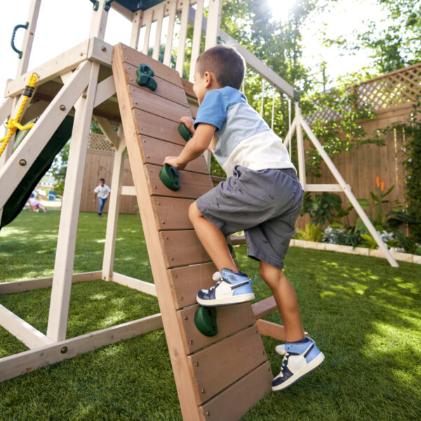 • Side-by-side rock wall and traditional slat ladder for multiple ways to climb