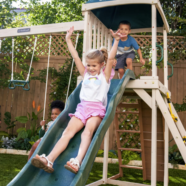• The KidKraft Emerald Challenge Swing Set can transform almost any yard size into an adventurous play zone for kids and their friends. From swinging, climbing and sliding, there’s plenty of action to keep the fun going up, down and around. Depending on kids’ skill level, there are three ways to climb to the top. Beginners can take it easy on the slat ladder. Intermediate steppers can traverse the rock wall, and experts can tackle the swaying rope net. All can enjoy the view from the top of the 48″ covered deck, though. When ready, the slide can carry kids to the ground with ripples of laughter. Lastly, a trio of swings provides high-flying journeys to the sky. Start transforming your backyard into an active area that kids will love with this wood play set designed for smaller spaces.