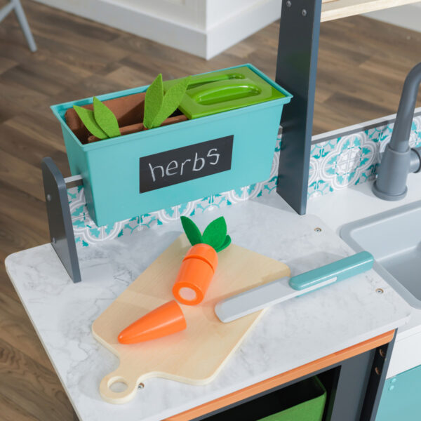 - From farm to plate, food is celebrated with the KidKraft Garden Gourmet Play Kitchen. Upscale elements, like the marble-Esque countertops, festive tile-look backsplash, and wooden butcher-block style island, are showcased in a down-to-earth set-up that’s reminiscent of today’s farmhouse chic movement. Kids will love working with the “pickable” veggies and herbs and chopping them to add to the most creative meal they can make up. Knobs that really turn and click and an ice maker with pretend ice cubes make the cooking experience more real. A recycling bin helps enforce the importance of helping out the environment. Chalkboard surfaces let kids express their artistic creativity and add personalization to this adorable kitchen where magic is sure to ensue.