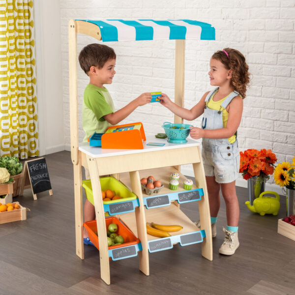 - Introducing the KidKraft Play Grocery Store Marketplace – a fantastic way for kids to explore their entrepreneurial spirit. This set comes complete with shelving featuring removable plastic bins for stocking items, chalkboard signs for labeling, a fabric awning, an interactive cash register, and even a play credit card, just like the real thing. With enough space for multiple kids to play together, it’s the perfect tool for promoting communication, critical thinking, and social skills. This versatile set can stand alone in your playroom, or you can pair it with any KidKraft play kitchen or role-play item for extended fun and imaginative play.