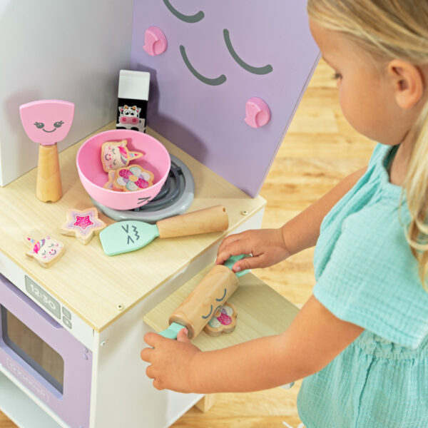 - Emojin’ the fun in the expressive KidKraft Lil’ Friends Play Kitchen that’s full of personality! With its own line of accessories, these new kitchen buddies will be fully equipped for cooking duty. Cheerfully decorated, this pastel-hued baking center is ready to whip up creativity. All doors feature cutout notches for opening and closing with ease. Magical graphic prints pop up on the bin, mitt, and even the cookies! With so much to discover—knobs, buttons, sounds—there will be stories, smiles, and sweet surprises all day in the Lil’ Friends Play Kitchen.