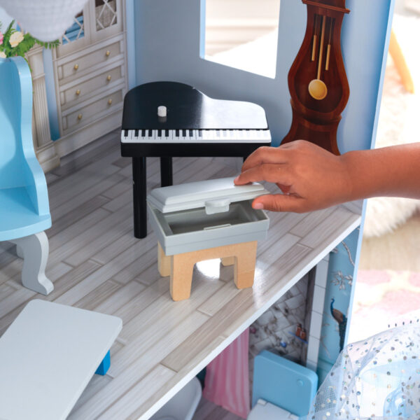 • Fantasies come to life for 12-inch dolls in the Magical Dreams Castle Dollhouse from KidKraft! Full of dreamy details, this dollhouse has a grand staircase that leads up to a garden patio. Fully furnished with 16 pieces of furniture and accessories, this house is ready for royal celebrations—there’s even a tiered party cake! Kids can get more hands-on in the palace with interactive components—cabinet doors open and close, piano and toilet make sounds, chandelier lights up, a frame can be personalized with your own picture, and there’s even a post-it note easel for impromptu artwork. A sheet of stickers lets castle decorators adorn the walls with majestic accents. Peel them off and use them again and again in different spots. Beautiful twin balconies, a fabric canopy roof, and grand shapes make this dollhouse perfect for princess make-believe stories to come true.