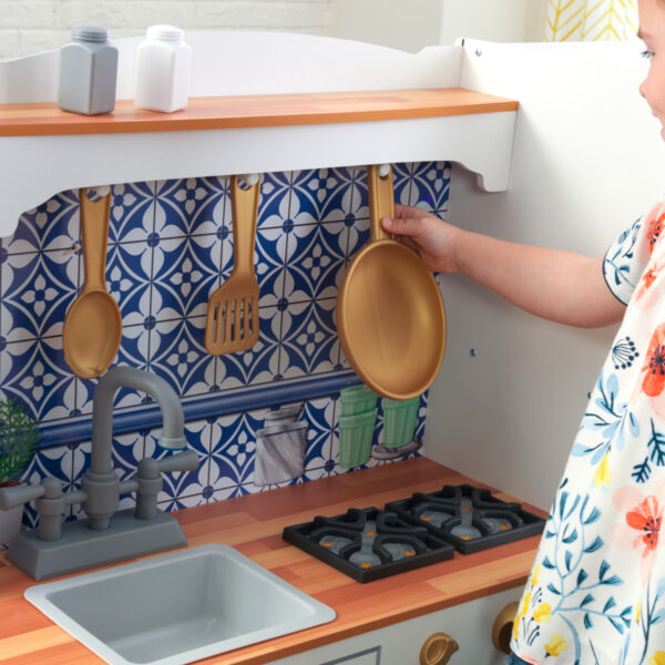 - Kitchen play just got a whole lot tastier with the exciting and trendy KidKraft Mosaic Magnetic Play Kitchen! Whip up fun for little chefs with this quaint play kitchen that’s packed with exceptional details and delicious features, including a magnetic refrigerator with a top freezer so kids can decorate with magnets or put up shopping lists. Nothing is cooler than the working ice maker that dispenses plastic ice cubes! When kids are ready to fire up the gas stove or the oven, they’ll be delighted to find that the knobs make a fun clicking sound when turned. As culinary creations are in the oven or microwave, kids can proudly show mom and dad what they’re making through the showcase doors! With a 6-piece accessory set, a spacious sink, and an adorable farmhouse design, the KidKraft Mosaic Magnetic Play Kitchen is the perfect addition to your little chef’s bedroom or playroom!