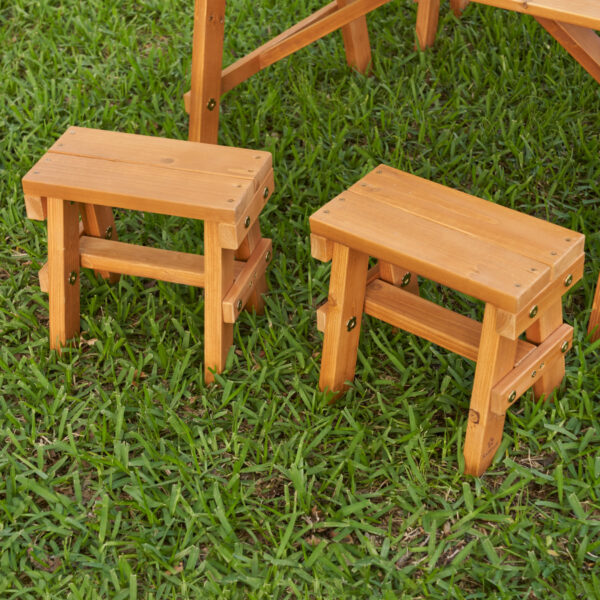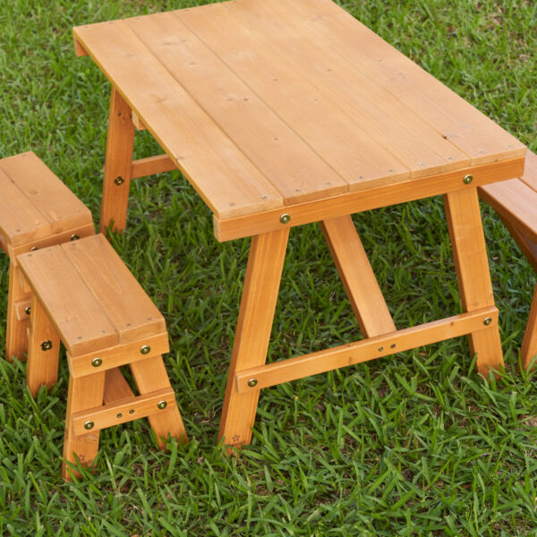 - The KidKraft Outdoor Picnic Table Set provides the ideal spot for kids to eat or play. Simple design is actually purposeful for ease of use and a more natural look for fitting into the environment. Angled legs, large slatted cedar wood with a water-based stain, and durable components keep the construction child-friendly. With three moveable benches, friends can join to have a snack, do art projects, or play with toys. Fits easily on the patio, in the backyard, or even indoors, if you want! You’ll find tons of use for this cute Outdoor Picnic Table Set.