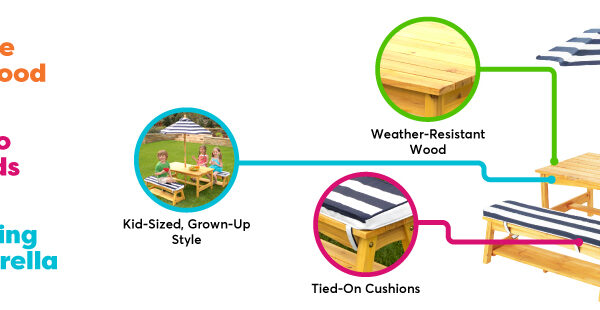 - The KidKraft Outdoor Patio Set is ideal for enjoying a picnic, playing games, or simply visiting on beautiful days. The adjustable umbrella offers shady relief from the summer sun and the padded benches are perfectly kid-sized. Constructed from weather-resistant wood with a beautiful stained finish, this set will look good for years to come. The honey-colored wood makes the navy and white striped fabric cushions and umbrella really pop. The bench cushion ties onto the base for a secure fit. The umbrella provides much-needed shade for little kids. It pairs nicely with grownup patio furniture as well, giving your backyard or patio a cohesive, updated look.