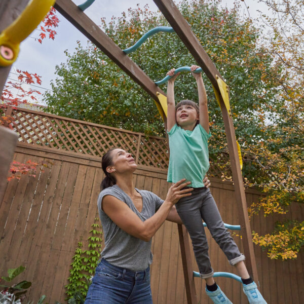 • Monkey bars with a twist—curved grips and angled base challenge and excite
