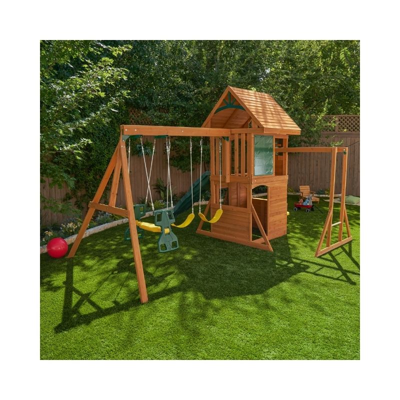 - It’s a playset. It’s a swing set. It’s a clubhouse and more. Built to handle up to nine active kids at once, the over-achieving Ridgeview Deluxe Clubhouse Playset by KidKraft offers a wealth of features like an extra-deep, extra-bumpy (extra-fun) high-rail wave slide and a rock wall/access ladder to the large upper clubhouse. Small primates can swing their way across the solid wood monkey bars, or drop over to the two high-flying belt swings and premium glider. On the lower level, a pretend café is open for business 24/7, complete with an order window, two stools, a serving ledge, and a colorful canopy. Upstairs, future teachers and artists will love expounding on the vinyl chalkboard tarp. Meanwhile, Mom and Dad can sit back and enjoy Ridgeview’s 100% premium lumber construction, attractive child-friendly stain, and thoughtful details (think dormer windows, shiplap roof, and flower box). The Ridgeview Deluxe Clubhouse by KidKraft all-in-one is the one for all!