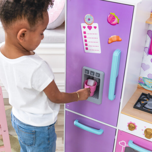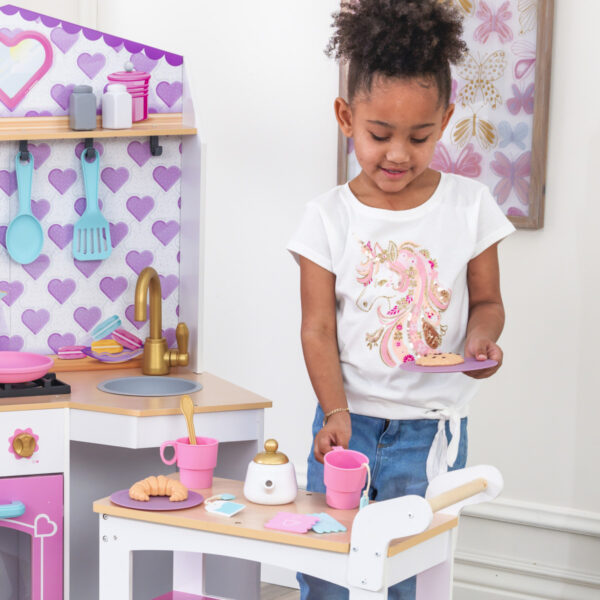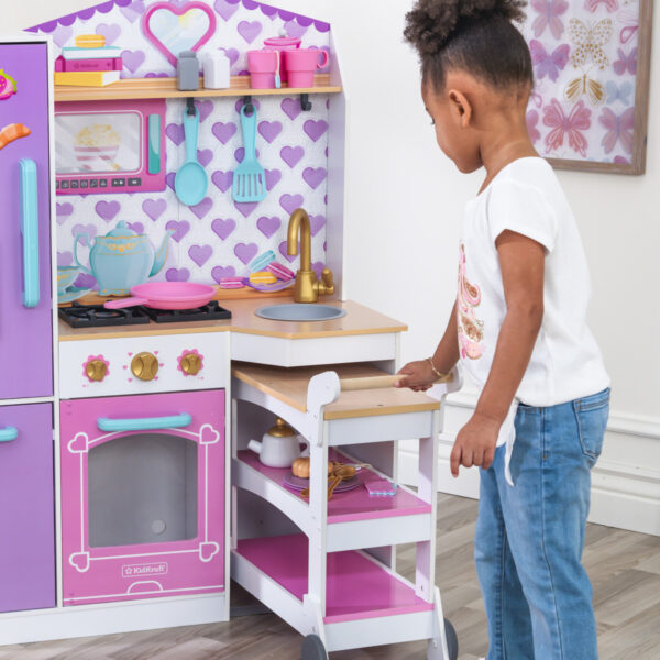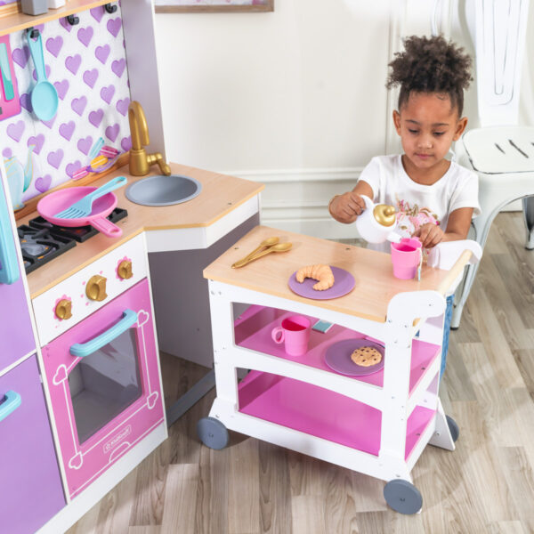 - From the heart-print backsplash to the charming tea service, the KidKraft Sweet Snack Time Cart & Play Kitchen is full of love. Prepare teatime at the cheerful kitchen, then place everything on the pull-out cart and serve to guests. Dishes and treats are included to have a party for two. Back in the kitchen, it’s easy to store everything—the cart slides back into its cubby, and all the doors open to reveal more play spaces. Kids will love interacting with the ice maker with pretend cubes, faucets,s, and turnable knobs. Hosting tea parties or snack time has never been so adorable as with the Sweet Snack Time Cart & Play Kitchen.