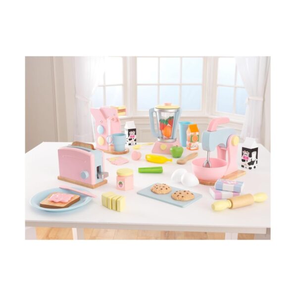- Start the day with a little imagination! The KidKraft Espresso Toaster Set is the perfect playtime accessory for young chefs. This charming wooden set includes realistic accessories such as bread, a butter knife, jelly, and a stick of butter that kids can “slice” apart for interactive fun. Simply drop the bread into the toaster, push the handle, and watch it pop back up—just like a real toaster! Designed for durability and creative play, this sturdy wooden set encourages role-playing, fine motor skills, and imaginative storytelling. It’s the perfect addition to any pretend kitchen and will provide years of high-fiber fun for little ones.