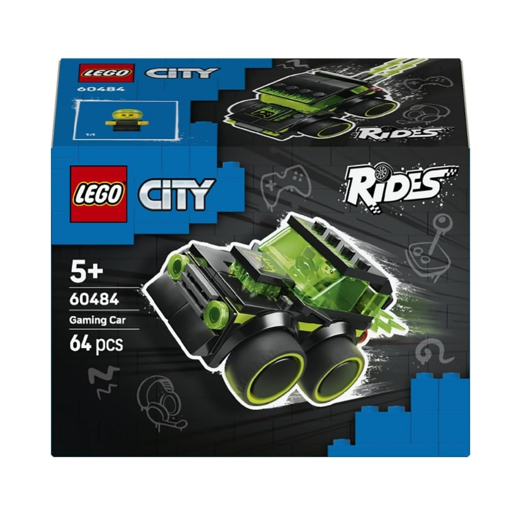 • LEGO 60484 City Rides set featuring a colorful gaming race car with a driver and racing accessories