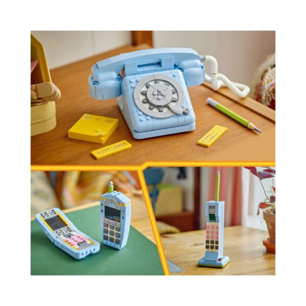 - Step back into the swinging 60s with the LEGO Creator Retro Telephone (31174)! This charming 3-in-1 building set brings nostalgic fun for both kids and adults, capturing the look and feel of a classic 1960s rotary phone. With its detachable handset, bendable cord, working dial, and playful hang-up spring function, this detailed model makes a delightful display piece or imaginative play toy. The set also includes clever accessories like a brick-built pencil and a customizable sticky notepad with three different notes — perfect touches for a desk, playroom, or collector’s shelf. A stylish mix of creativity, nostalgia, and fun, this set is sure to spark smiles in builders of all ages.
