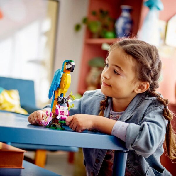 - Little builders and passionate animal fans aged 7+ can travel deep into the rainforest for action-packed stories with this LEGO® Creator 3in1 Exotic Parrot (31136) building set. It features a colorful parrot that can fully rotate its body while sitting on a tree branch and move its wings and tail.
