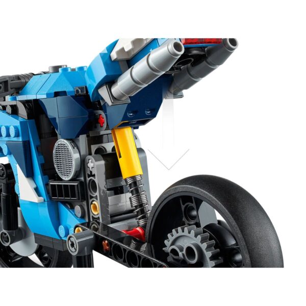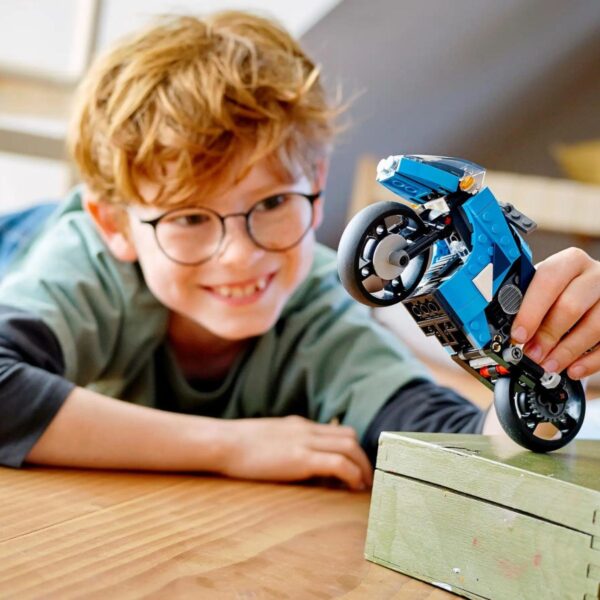• Inspire kids’ passion for cool motorbikes and creative building with the impressive LEGO® Creator 3in1 Superbike (31114) toy set. Kids will love staging exciting race action with this modern motorbike toy, which features moving handlebars, a working suspension, and a kickstand.