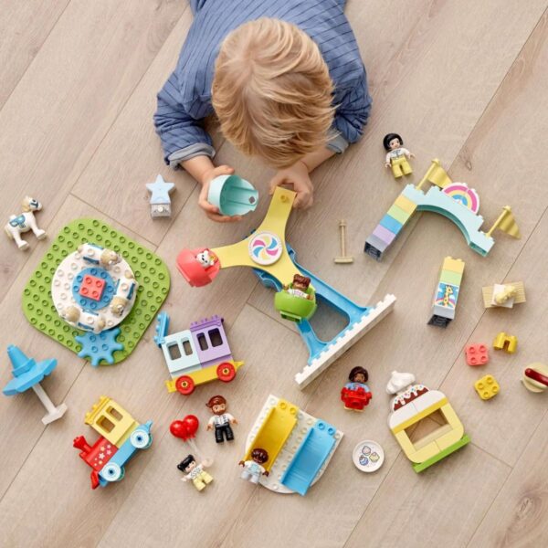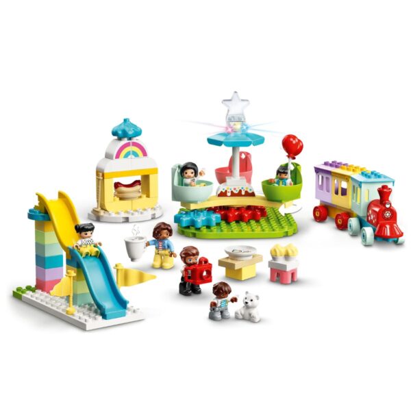 - Includes 7 DUPLO® characters – 2 women, 1 man, and 4 children – 2 slides, a mechanical carousel, a turning Ferris wheel with 3 colorful cabins, a push-along train, and lots of fun extras.