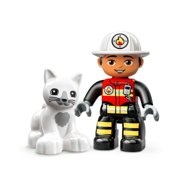 - The set includes a firefighter and a cat LEGO® DUPLO® figures, plus a buildable tree and a multi-function fire truck with flashing lights and a siren (batteries included)
