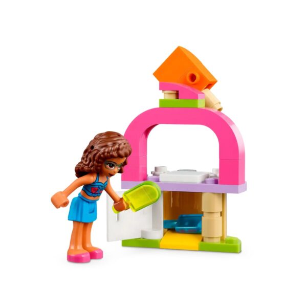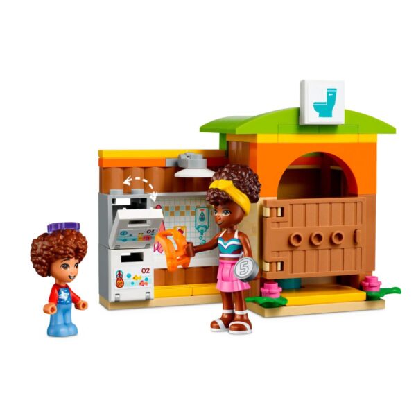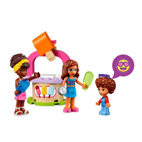 There are lots of realistic features to explore, including 2 slides, a spraying octopus, a waterfall shower, and a grotto with an aquarium. Away from the splash action is a cute changing area complete with a shower and restroom. LEGO Friends Olivia, Santiago, and Nandi can cool down with a treat from the popsicle stand and relax under the sunshades. - Boost building fun