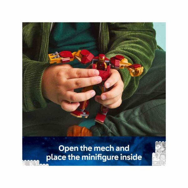 - Interactive Play: The mech’s torso opens to reveal a cockpit, allowing the Iron Man minifigure to take command of the battle.