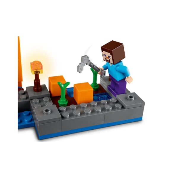 - Character Figures: Features Steve with a hoe and bow, a potion-flinging witch, and a frog with frogspawn.