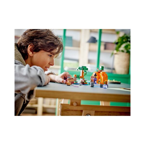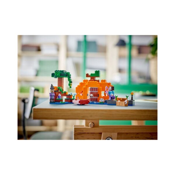 - The LEGO Minecraft The Pumpkin Farm set, for kids 8 and up, features a buildable pumpkin-shaped house from the game’s swamp biome. It includes characters like Steve, a witch, and a frog, along with a pumpkin patch, crafting table, furnace, frog light, toy boat, and treasure chest, offering a rich, immersive Minecraft experience.