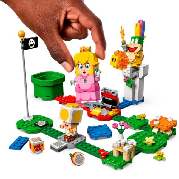 - Introduce children to the interactive LEGO® Super Mario™ universe with this Adventures with Peach Starter Course (71403). It features a LEGO® Peach™ figure that gives instant expressive responses via an LCD screen and speaker. LEGO Peach can be connected to LEGO® Mario™ or LEGO® Luigi™ (extra figures not included) via Bluetooth to win bonus coins for teamwork.