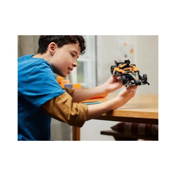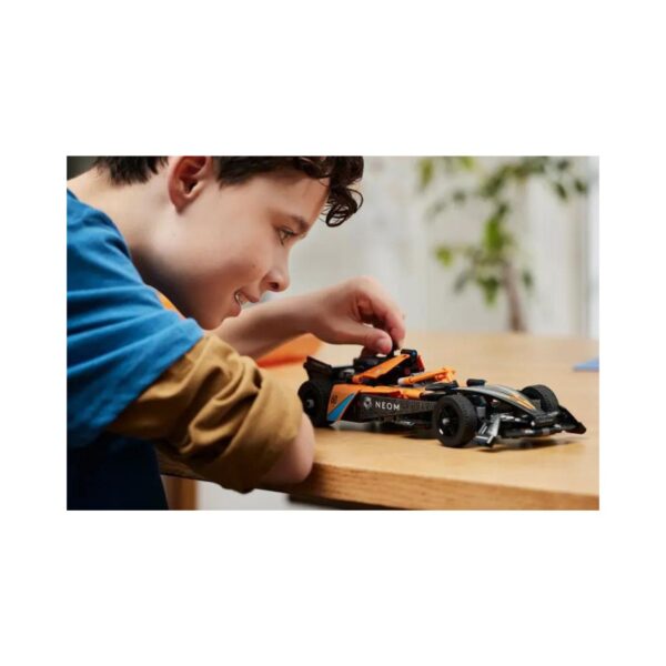 - The LEGO Technic NEOM McLaren Formula E Race Car set, for kids aged 9 and up, allows young racing fans to build a detailed Formula E car with a double pull-back function for high-speed action. The model features a functional steering mechanism, providing a hands-on experience of motorsport and engineering. This set combines educational elements with thrilling play, perfect for aspiring young engineers and race car enthusiasts.