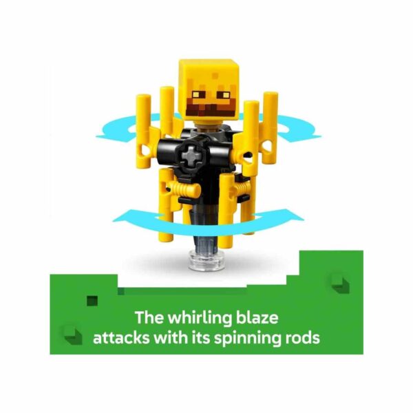- Authentic Minecraft Details: Wither skeleton wields a stone sword for intense combat. Blaze mob features spinning rods for a whirling attack effect. Strider comes with posable legs and a saddle, allowing Alex to ride to safety.