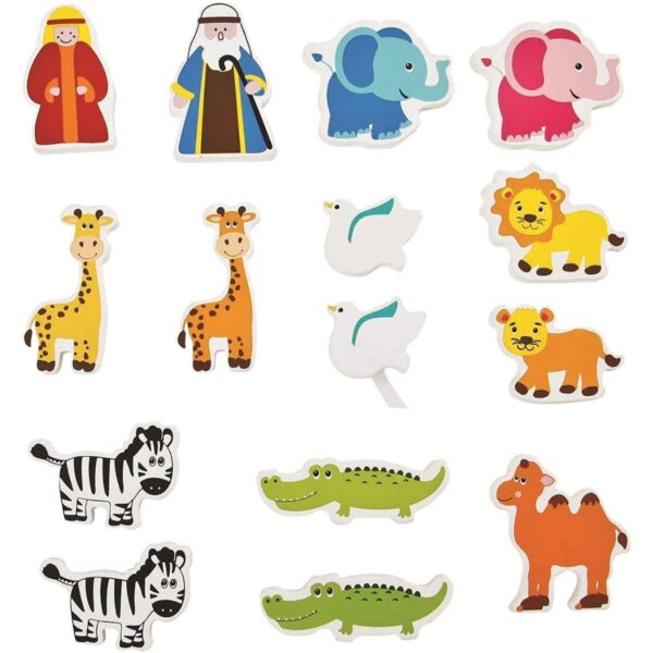 • A storytelling toy that a parent or grandparent can teach the children about Noah and his Ark. Comprises Mr. And Mrs. Noah, 13pcs animals, and a colorful Ark. All the pieces can be stored away inside the boat. Develop hand-eye coordination and imagination skills.